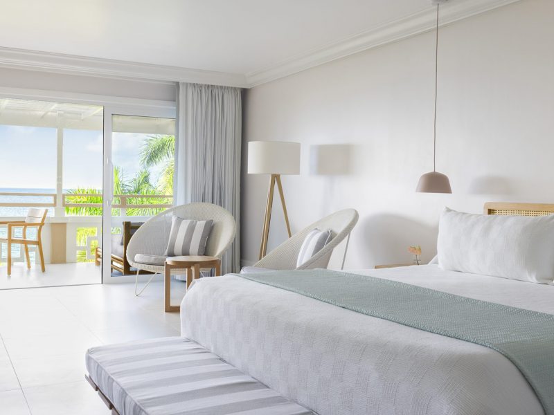 This upper-level suite boasts a tranquil bedroom with direct access to a private balcony, where sweeping views of lush tropical surroundings invite serenity and sunlight. Floor-to-ceiling windows bathe the space in natural light, creating a warm and airy ambiance perfect for relaxation.