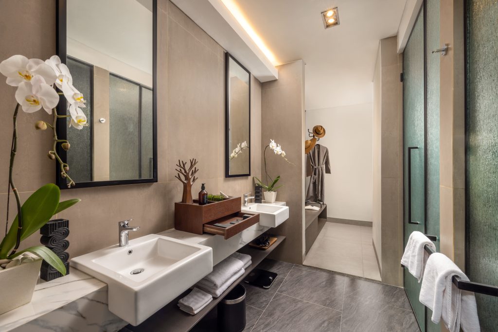This Two Bedroom Lagoon Access boasts a tranquil bedroom with direct access to a private terrace, where sweeping views of lush tropical surroundings invite serenity and sunlight. Floor-to-ceiling windows bathe the space in natural light, creating a warm and airy ambiance perfect for relaxation.
